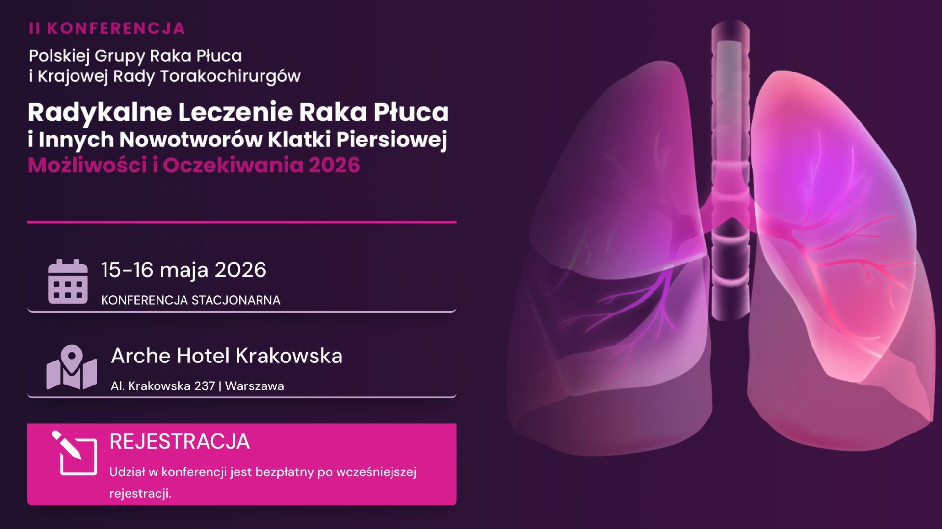 Zapraszamy na konferencję „Radykalne Leczenie Raka Płuca i Innych Nowotworów Klatki Piersiowej. Możliwości i Oczekiwania 2026”, która odbędzie się już 15–16 maja.